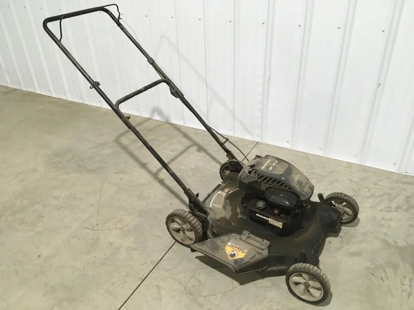 Lawn equipment, spreaders, chainsaws, jacks, fans, vintage items, and assorted shop and garage finds.
